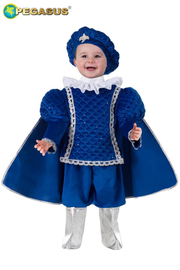 Il costume da Imperatore lusso prima infanzia è disponibile in 4 taglie a partire da 10/12 mesi fino a 25/36 mesi.Confezionato nel pratico scatolo 8x29x40, all’interno presenti i seguenti elementi: casacca, pantalone, mantello, soprascarpe e cappello. Design Italiano: casacca con chiusura a strappo dietro, creata in tessuto velluto blu, maniche a sbuffo e davanti realizzati in tessuto velluto trapuntato con paillettes e arricchiti da passamaneria laminata; il collo in tessuto raso plisse. Pantalone con elastico in vita in tessuto velluto blu, soprascarpe modello stivali in tessuto crespo laminato accoppiato color argento, cappello modello basco realizzato in tessuto velluto blu e sempre il velluto blu creato anche il mantello con bordi in sbiego laminato.Avvertenze: indossare sotto visione di un adulto.Istruzione lavaggio: lavare a mano a bassa temperatura, lavare le parti separatamente, non strizzare, stirare a 110 gradi massimo a rovescio. marchesivelluto,primipassi, IMPERATORE, ARGIGIANALI, VELLUTO, imperatorilusso, PRINCIPIEPRINCIPESSEPRIMAINFANZIA, slidelineaoro