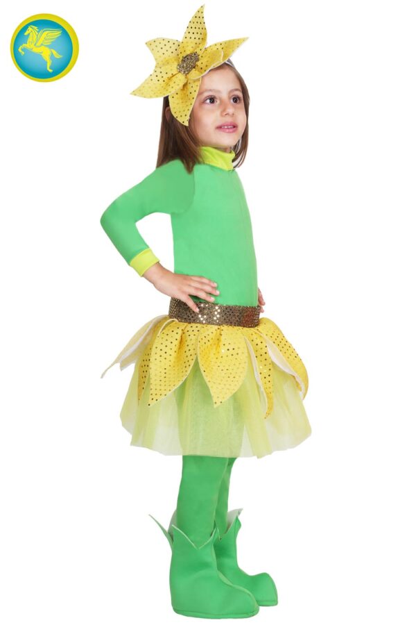 Il costume piccola girasole è disponibile in 3 taglie a partire dalla 3° fino alla 5°.Nel pratico scatolo 8x26x30 del costume da Piccola girasole troverai i seguenti elementi: tutina, copriscarpe, cintura con tulle e petali in tessuto e frontino con petali in tessutp.Il costume è realizzato in maglina, maglina accoppiato, tulle e paillettes accoppiato. FIORI, FIORELLINI, SLIDEFIORE