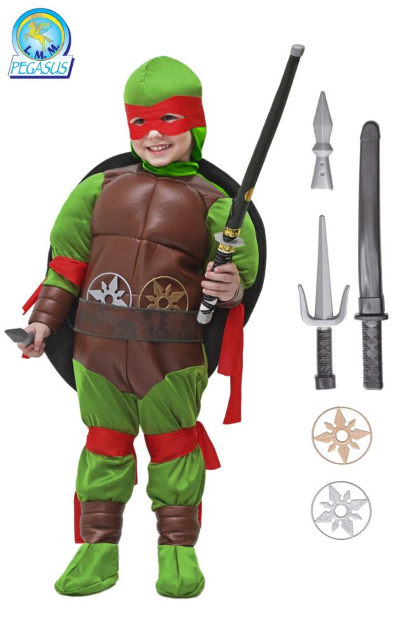 Il costume tartaruga baby di pegasus è disponibile in 2 taglie 3° e 4°.Nel pratico scatolo 8x48x36 del costume da Tartaruga baby di pegasus sono presenti i seguenti elementi: tuta, guscio, cinta, fascie (in 4 colori), soprascarpe, maschera, cappuccio e set ninja 5 elementi.Il costume è realizzato in maglina, ecopelle accoppiato e ecopelle invecchiata.Designer Italiano: modello tuta intera con chiusura zip sul retro realizzata in maglina ed ecopelle accoppiato sul petto, cinta in ecopelle invecchiata.Accessori ninja inclusi.Costume perfetto per feste di Compleanno, Travestimenti, feste a tema, Cosplay, giochi di finzione, giochi di ruolo, Carnevale e sfilate di Carnevale.Avvertenze indossare sotto visione di un adulto.Istruzione lavaggio: lavare a mano a bassa temperatura, lavare le parti separatamente, non strizzare, stirare a 110 gradi massimo a rovescio. tartaruga, turtles, shredder, ninja, tartarughe, tmnt, teenage, mutant, tartarugheninja, supereroibaby