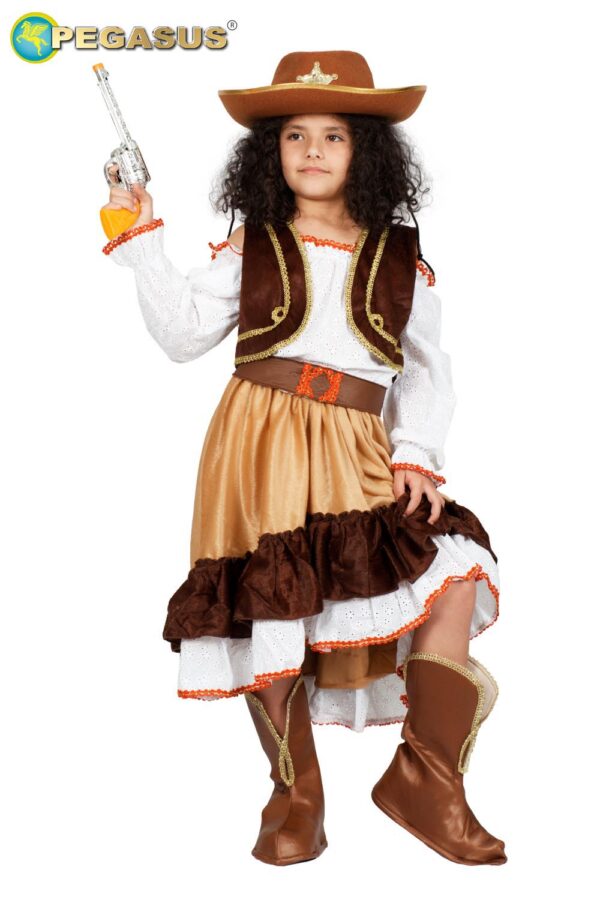 Il costume cow girl è disponibile in 5 taglie a partire da S 5/6 ANNI fino a XXL 12/13 ANNI.Nel pratico scatolo 10x48x36 del costume da Cow girl troverai i seguenti elementi: cappello,foulard, panciotto, vestito, cintura e pistola. Il costume è realizzato in dainetto, tela pizzo, passamaneria lamè e raso. SCERIFFO, FARWESTBAMBINO, COWGIRL, COW GIRL, FARWEST