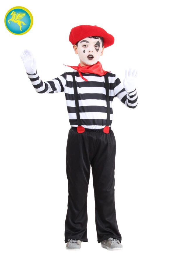 Il costume mimo bambino è disponibile in 4 taglie a partire da S 5/6 ANNI fino a XL 10/11 ANNI.Nel pratico scatolo 8x26x30 del costume da Mimo bambino troverai i seguenti elementi: maglietta, pantalone con bretelle, guanti, cappello e foulard. Il costume è realizzato in maglina stampato, maglina e raso stampatoIl Mimo è già presente nel teatro antico greco e latino, era una farsa popolaresca dei dori di Sicilia.Negli anni Venti e Trenta del 20° secolo nasce in Francia il Mimo Astratto del Novecento. Sinonimo di imitazione muta FRANCIA, pantomima, ILOVEPARIS