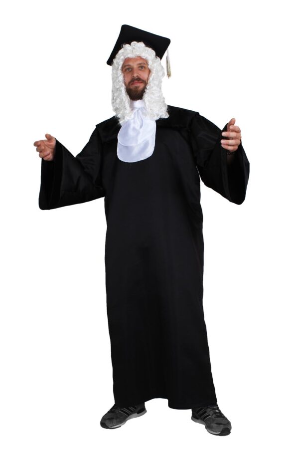 Il costume Giudice è disponibile in taglia unica.Nel pratico scatolo 10x48x36 del costume da Giudice troverai i seguenti elementi: parrucca, cappello, tunica, bavetto.Il costume è realizzato in raso, velluto, velluttino accoppiato, passamaneri, frangie. MAGISTRATO, laurea, laureato, avvocato