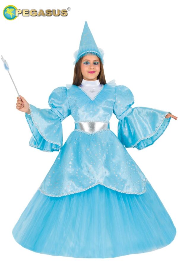 Confezionato nel pratico scatolo 10x47x35, all’interno presenti i seguenti elementi: vestito, cintura, cappello, bacchetta e sottogonna con 2 cerchi.