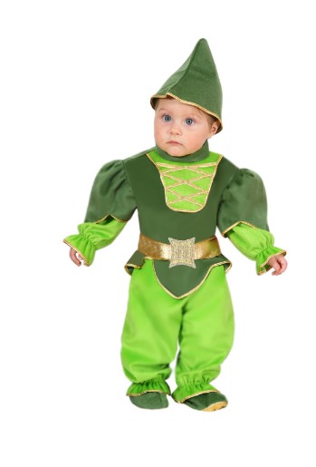 Designer italiano:Il costume è composto da uno sfizioso cappellino verde,da una casacca con chiusura a strappo sul di dietro arricchita da una cintura cucita e da una fibbia oro.Il costume si completa con un pantalone e due copriscarpette verdi.