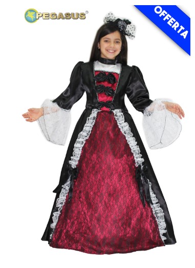 Il Costume Principessa Vampiria è disponibile in 4 taglie a partire dalla S 5/6 ANNI fino alla XL 10/12 ANNI. Nel comodo scatolo 8X48X36 troverai i seguenti elementi: cappellino, vestito e sottogonna con 2 cerchi.
