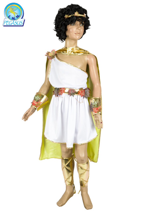 Il costume Bacco(per i romani) o Dioniso (per i greci) dio del vino è disponibile in 5 taglie a partire da 5/6 ANNI fino a 13/14 ANNI.Nella confezione del costume da Bacco dio del vino e dei misteri troverai i seguenti elementi: parrucca, tiara, mantello, casacca, polsini, cintura e cavigliere.Il costume è realizzato in maglina, crespo lamè, sbieco oro e applicazioni foglie.Costume perfetto per feste di Compleanno, Travestimenti, feste a tema, Cosplay, giochi di finzione, giochi di ruolo, Carnevale e sfilate di Carnevale.Materiale: tutte le parti 100% tessuti poliestere.Avvertenze indossare sotto visione di un adulto.Istruzione lavaggio: lavare a mano a bassa temperatura, lavare le parti separatamente, non strizzare, stirare a 110 gradi massimo a rovescio. dio, grecia, dei, dionisio, vino, MITOLOGIA, ANTICAGRECIA, ROMA, IMPEROROMANO, divinita’, mitologia, olimpo, vendemmia, giove