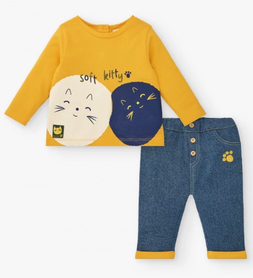 Set da bambino composto da una maglietta gialla a maniche lunghe con stampa di gattini nei toni del crema e del blu navy e la frase “soft kitty”. I pantaloni in denim blu con dettagli gialli e una stampa ricamata sulla gamba completano perfettamente la t-shirt, creando un look comodo e divertente da indossare tutti i giorni. Appartiene alla collezione Lovely Kittens
