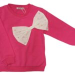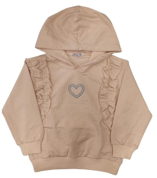 Felpa bambina in cotone garzato Lollitop.Si presenta a tinta unita con cappuccio,elastico ai polsini e sul fondo,stampa frontale cuore glitterato e dettaglio frontale in rouche.