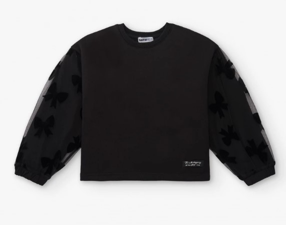 Felpa da bambina di colore nero, messa in risalto dalle eleganti maniche in tulle decorate da fiocchi, che aggiungono un tocco sofisticato e moderno. Realizzata in un tessuto morbido e confortevole, questa felpa è perfetta per aggiungere uno stile chic a qualsiasi outfit casual. Ideale da abbinare a jeans, gonne o pantaloni larghi, creando un look versatile e alla moda. Appartiene alla collezione Magic Poetry