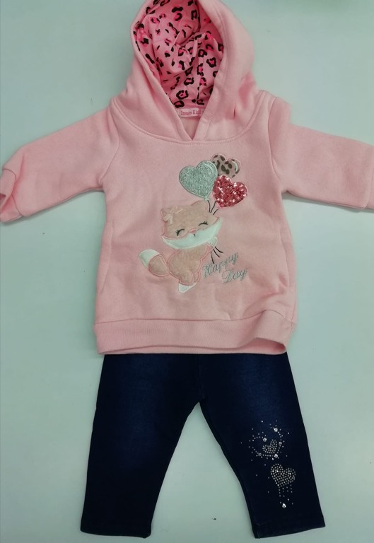 FELPA CON CAPPUCCIO+ POLSINI,STAMPA ORSACCHIOTTO + CUORICINI,CON TASCHE,FANTASIA MACULATA INTERNA AL CAPPUCCIO,LEGGINGS DI JEANS CON CUORICI DI STRASS,FELPATO INTERNAMENTE.
