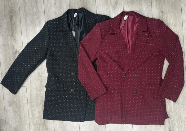 Blazer a pois eleganti e versatili, perfetti per le feste o per un look da ufficio raffinato! Disponibili in due varianti: nero classico o bordeaux intenso, entrambi con delicati pois chiari per un tocco glamour. Taglio doppiopetto, vestibilità femminile e tessuto confortevole: abbinali a pantaloni, jeans o gonne per outfit impeccabili!