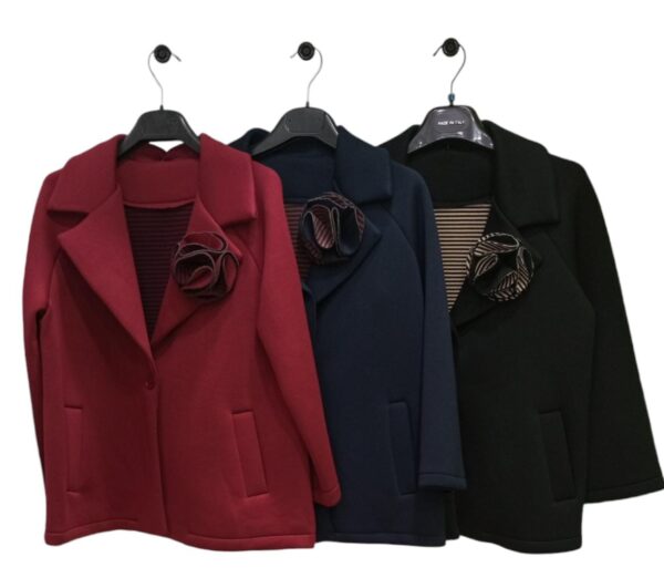 Giacca da donna taglia unica in neoprene.Presenta chiusura con un bottoncino frontale ,tasche a filetto,maniche a campana e dettglio frontale applicazione spilla.