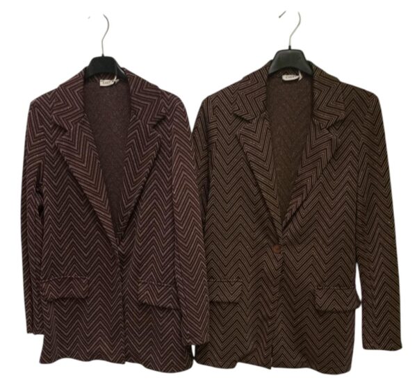 Giacca donna in taglia unica,vestibilita’regular adatta alla stagione autunno/inverno.Presenta un bottone frontale e finte tasche ed e’a fantasia con righe asimmetriche e filo in lame’.