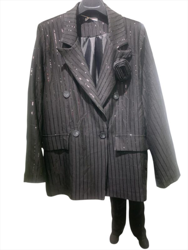giacca donna con paillettes modello doppio petto, petto a lancio, tasca anteriore. abbinabile al pantalone ref 24791.