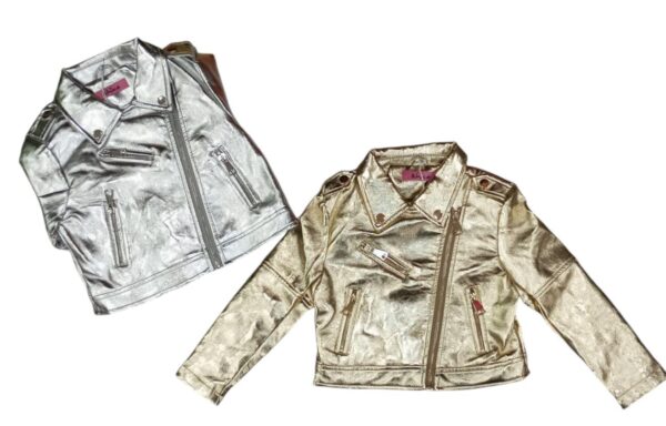 Giubbottino in ecopelle bambina.Presenta apertura con zip laterale,tasche frontali ed una in alto a destra e due bottoncini sul collo e sulle spalle.