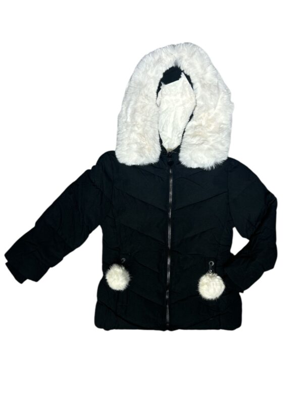 Giubbotto lungo invernale bambina.Si presenta a tinta unita con pelliccia del cappuccio estraibile,polsini,apertura a zip,tasche frontali con chiusura a zip e dettaglio pom pom bianco.All’interno e’rivestito di morbida pelliccia che si estende anche lungo tutto il cappuccio.