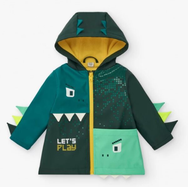 Giacca impermeabile per ragazzi nei toni del verde, con un divertente design di dinosauro che include dettagli in rilievo come denti bianchi e spine sul retro e sul cappuccio. La giacca presenta un cappuccio foderato di giallo, che aggiunge un tocco di colore a contrasto. La chiusura frontale con cerniera giallo brillante lo rende facile da indossare e le tasche frontali offrono spazio extra per piccoli oggetti. La stampa pixelata e la frase “Let’s Play” sul lato completano il look, rendendo questa giacca un’opzione perfetta per mantenere il bambino asciutto e caldo nelle giornate piovose. Appartiene alla collezione Cyber Dino