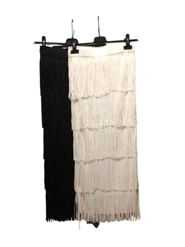 – Look dinamico e glamourGonna lunga con frange a strati, disponibile in due colori eleganti: nero e panna.
