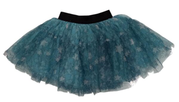 Gonna in tulle bambina IDO.La gonna e’in tulle a fantasia stelline,presenta elastico in vita in velluto nero ed e’foderata.