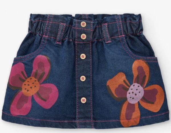 Gonna in denim per bambina nel classico colore blu, decorata con un’allegra stampa floreale dai toni vivaci che aggiunge un tocco di colore e freschezza. La gonna presenta una cintura elastica arricciata per il massimo comfort e bottoni decorativi sul davanti per un dettaglio elegante. Ideale da abbinare a t-shirt o felpe, questa gonna è perfetta per tutti i giorni o per le occasioni speciali. Appartiene alla collezione Super Natural
