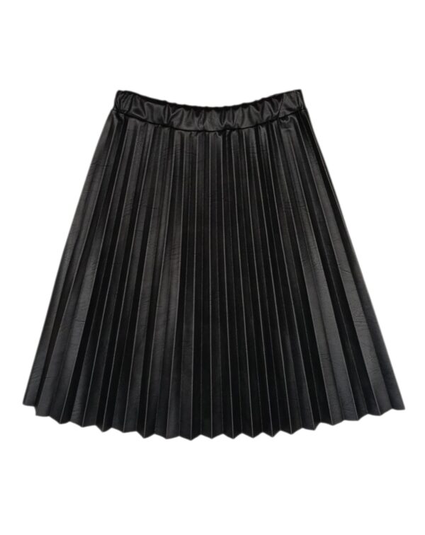 onna plissettata nera in ecopelle, dal design moderno e versatile. La texture effetto pelle dona un tocco grintoso e sofisticato, mentre le pieghe regolari creano un movimento elegante ad ogni passo. Dotata di comodo elastico in vita per una perfetta vestibilità, è un capo ideale da abbinare sia a look casual con sneakers e maglione, sia a outfit più chic con stivaletti o tacchi.