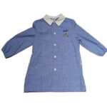 Il capo presenta quadretti bianchi e celesti, un colletto bianco a punta e polsini elasticizzati.