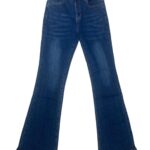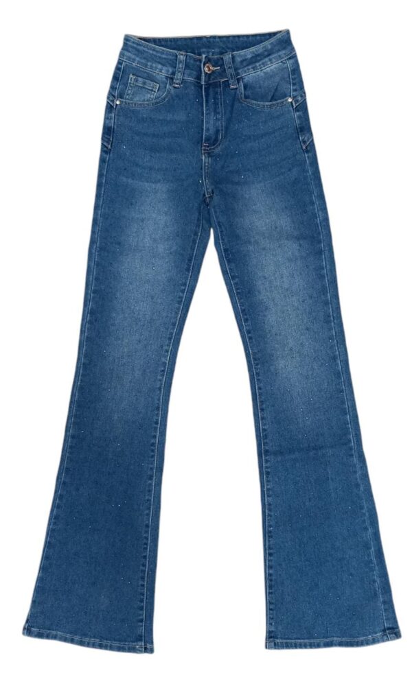 Jeans da donna a zampa.Si presenta a tinta unita e bottoncino in vita con glitter sulla parte frontale.
