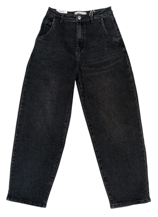Jeans donna baggy.Presenta cavallo basso,bottoncino in vita ed e’ampio sui fianchi e sulla gamba.