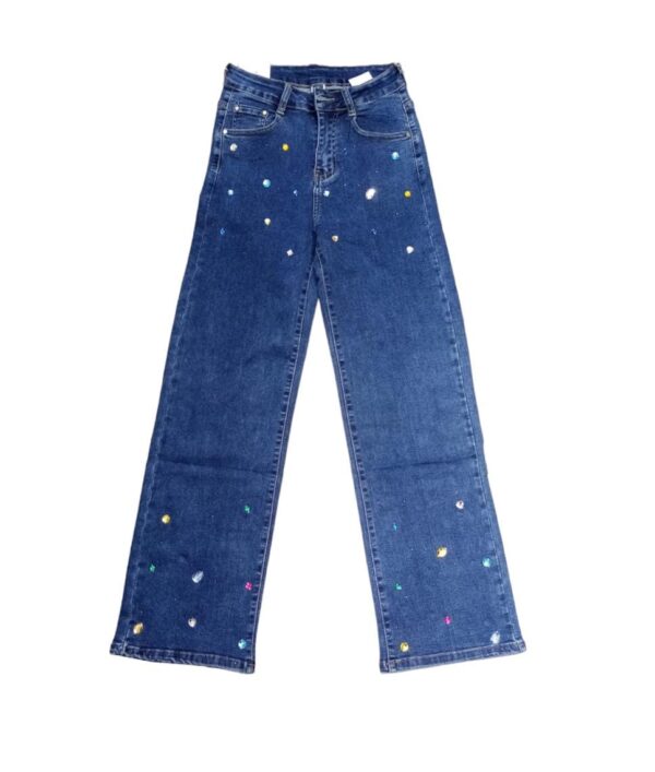 Il capo, a tinta unita, presenta una chiusura a zip con bottone, 5 tasche e dettaglio di brillantini e strass.