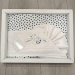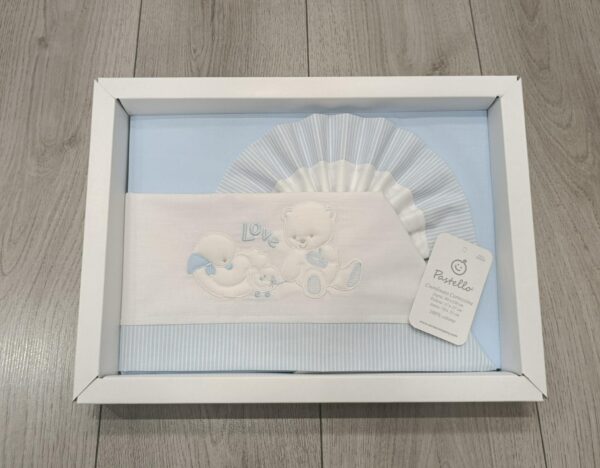 – Orsetto e AnatroccoloDolcissimo set lenzuolino per culla in puro cotone, decorato con un tenero ricamo raffigurante un orsetto e un anatroccolo con la scritta “Love”.