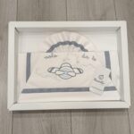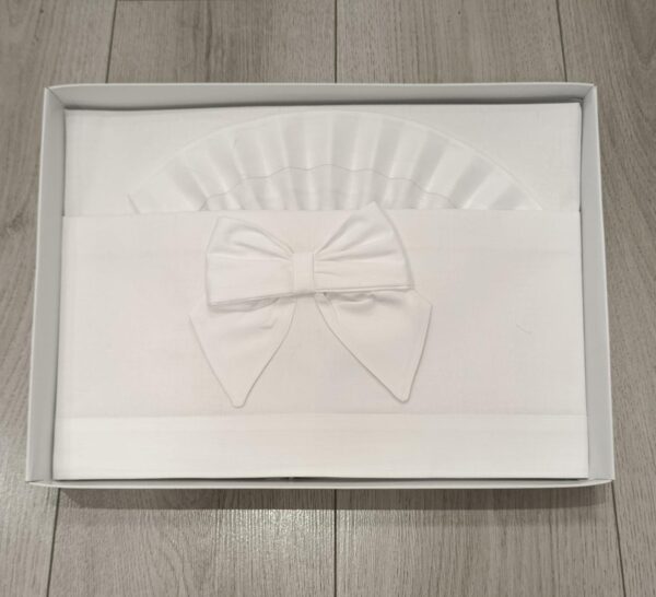 Decorato con raffinato fiocco centrale e balza plissettata, è ideale per donare un tocco di stile e dolcezza al corredino del neonato.