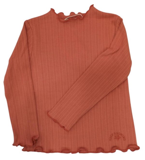 Maglia a costine bambina Losan.Si presenta in tinta unita con stampa in basso a sinistra,collo a lupetto con orlo a lattuga anche sui polsini e sul fondo.