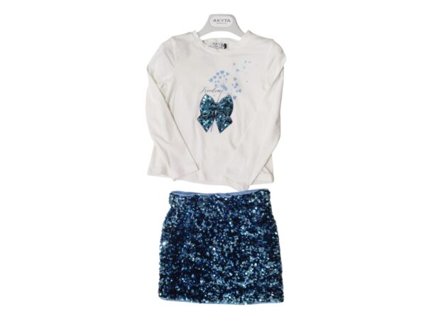 la maglia presenta una stampa tema cuori cobalto , applicazione di paillettes luixury tema fiocco.