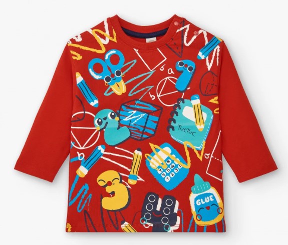 T-shirt a maniche lunghe da ragazzo in rosso, progettata con una stampa vivace e divertente a tema scolastico che include grafiche colorate come matite, forbici, calcolatrici e colla. Realizzata in un tessuto morbido e confortevole, questa t-shirt è ideale da indossare tutti i giorni, offrendo stile e funzionalità. Il design include bottoni sulla spalla per vestirsi e svestirsi facilmente, garantendo comfort ad ogni utilizzo. Perfetto da abbinare a jeans o joggers, questo capo si distingue per originalità e dinamismo. Appartiene alla collezione Big Brains