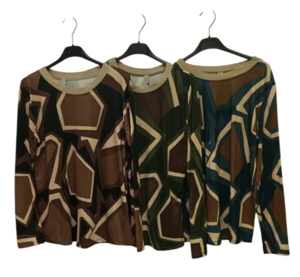 Maglia donna elasticizzata adatta alla stagione autunno/inverno.Si presenta a fantasia con scollatura a giro e bordo in lame’color oro.Taglia unica.