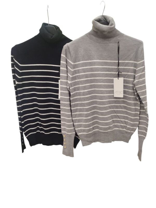Maglia dolcevita donna a righe, disponibili nei colori nero-panna e grigio-panna con particolarità al polso con bottoni d’oro