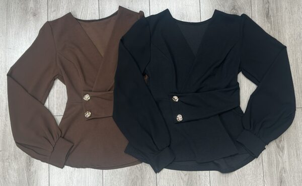maglia donna elegante, disponibile in due varianti: nera e marrone. con maniche semi trasparenti e sono presenti due bottoni gioiello