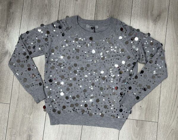 maglia donna a manica lunga con paillettes argentati di varie dimensioni creando un effetto super luminoso