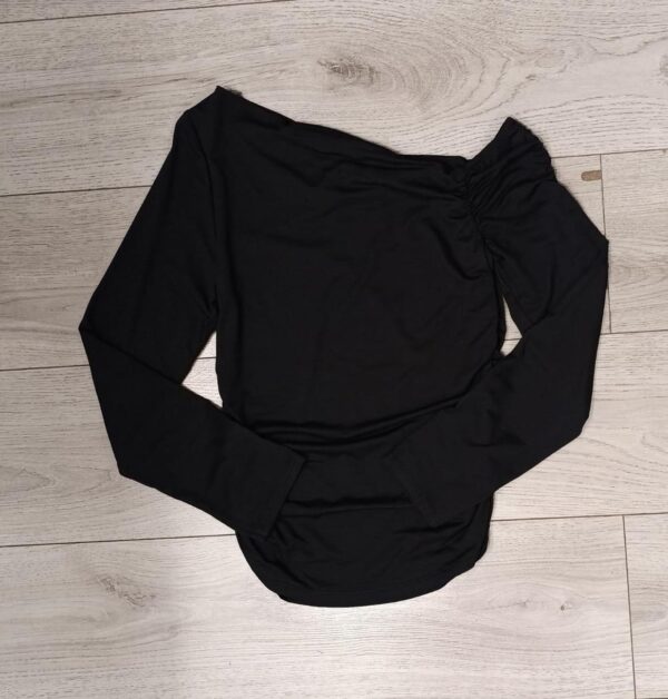 Maglia donna dal design essenziale ed elegante, realizzata in tessuto morbido ed elasticizzato di colore nero. Modello a manica lunga con linea aderente, caratterizzato da arricciatura laterale che valorizza la silhouette e dona un tocco femminile. Vestibilità confortevole, ideale da indossare sia da sola che sotto giacche o cappotti. Perfetta per look casual chic o outfit più raffinati.