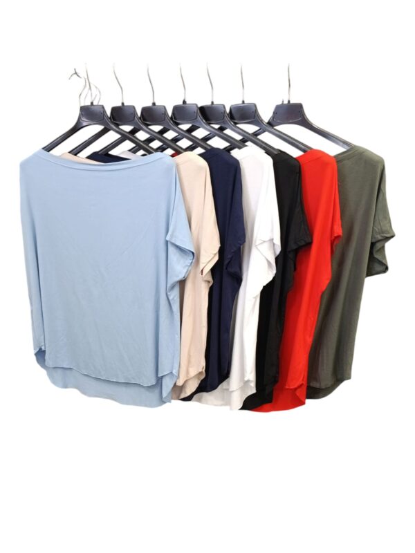 Maglia a manica corta dal taglio morbido e fluido.Realizzata in tessuto leggero e traspirante.Disponibile in diversi colori: azzurro,beige,blu,bianco,nero,rosso e verde.Taglia unica.