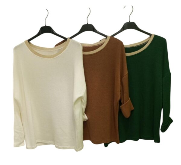 Magia donna in 50%viscosa.Si presenta a tinta unita,con scollatura a giro e bordo in lame’color oro.Adatta alla stagione autunno/inverno.Taglia unica,vestibilita’curvy.