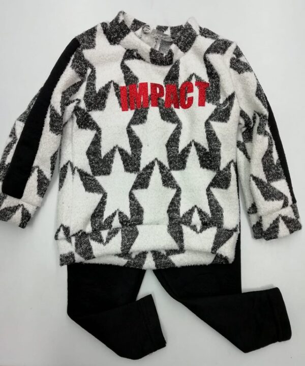 MAGLIONCINO A GIROCOLLO A FANTASIA STELLE,CON POLSINI+PANTALEGGINGS TINTA UNITA FANTASIA ROSELLINE TINTA SU TINTA,ELASTICIZZATO.