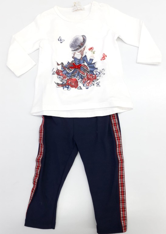 MAGLIA A GIROCOLLO,CON CHISUURA 2 BOTTONI AL COLLO LATERALI,CON STAMPA BIMBA+FARFALLE,FIORI,STRASS APPLICATI,LEGGINGS CON BANDE LATERALI A QUADRI,IN CALDO COTONE ELASTICIZZATO.
