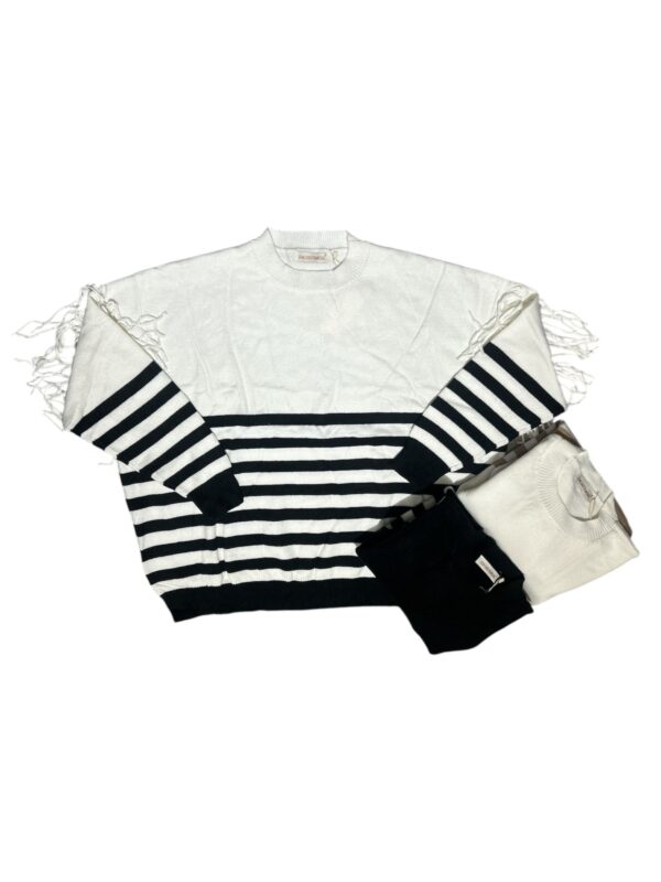 Maglione donna curvy adatto alla stagione invernale.Si presenta con scollatura a giro,polsini e dettaglio frange sulle maniche.