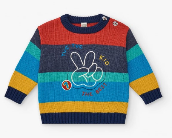 Maglione per bambini realizzato in tessuto a maglia con strisce orizzontali in colori vivaci come rosso, blu, verde e giallo. Il design prevede un ricamo centrale con un simbolo della pace e la frase “Tuc Tuc Kid The Best”, aggiungendo un tocco divertente e moderno al look. I bottoni sulle spalle facilitano l’indossamento e la rimozione, mentre i polsini e l’orlo a coste assicurano una vestibilità comoda e calda. Ideale per le giornate fresche, questo maglione unisce stile e comfort da indossare tutti i giorni. Appartiene alla collezione Big Brains