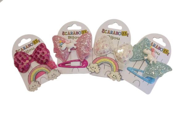 Ogni set include due clip con fiocchi luccicanti, arcobaleni o dolcissimi unicorni con ali glitter.
