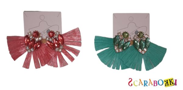 orecchini con lavorazione in paglia e applicazione di strass e pietre .