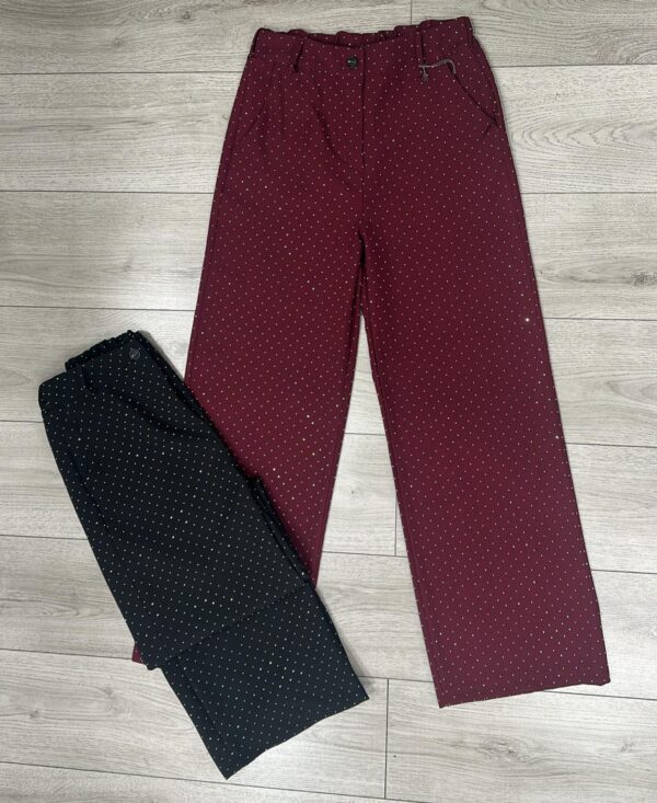 pantaloni donna con micro-pois luminosi,dal taglio dritto e morbido. A vita alta con passanti, tasche laterali e una vestibilita’ comoda ma raffinata. Perfetti per look da giorno o da sera, aggiungono un tocco chic a qualsiasi outfit. Presente in due colori: nero e bordeaux