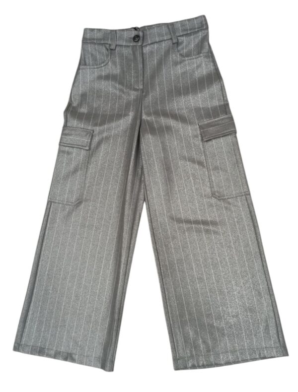 Pantalone gessato a palazzo cargo bambina Akita.Il pantalone si presenta con bottoncino e coulisse in vita e passanti per inserire la cintura.E’in tessuto pesante adatto per l’inverno ed e’ideale da abbinare alla felpa Akita ref.471293.