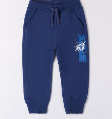 Pantalone per bambino iDO 3 – 8 anni realizzato felpa leggera. Il modello presenta vita elasticizzata con coulisse, tasche laterali e stampa sulla gamba. Polsini sul fondo gamba elasticizzati.
